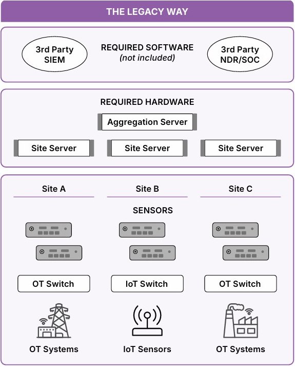Other OT/IoT cybersecurity solutions require to use third party software and invest in hardware to deploy their sensors. That adds to both cost and complexity.